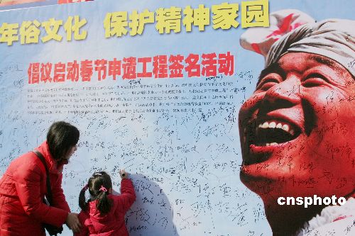 2月11日,江苏南京启动“复兴年俗文化,保护精神家园”倡议春节申遗工程签名活动,得到众多市民响应。据介绍,由《中国旅游地理杂志》、南京大学民俗艺术研究室等单位发起的这一活动,旨在唤醒国民保护春节年俗文化的自觉意识,增强国民保护春节年俗文化的责任感。中新社发 文宝 摄