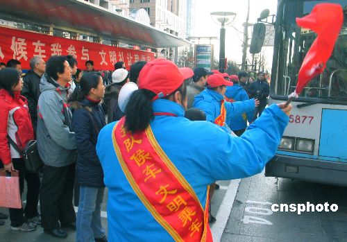 2月11日,北京王府井公交站台市民自觉排队上车。据悉,北京把每月11日定为“自觉排队日”,倡导民众这一天在车站、银行等公共场所自觉排队。当日,首个自觉排队日主场活动在王府井举行。中新社发 吴芒子 摄