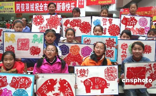 2月12日,参加文化节的孩子们展示自己的剪纸作品。2007中国第三届(大连)年文化节在大连市沙河口区西安路拉开了帷幕,本届文化节将开展楹联文化、剪纸文化、生肖文化等系列活动,50多名剪纸艺术家和爱好者进行现场表演,百余名书画家泼墨挥毫进行现场表演,两万多春联和福字向市民大赠送。中新社发 徐德武 摄