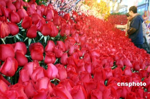 2月13日,情人节将至,山城重庆玫瑰等鲜花进入销售旺季,前来花店选购鲜花的顾客络绎不绝。中新社发 郭晋嘉 摄