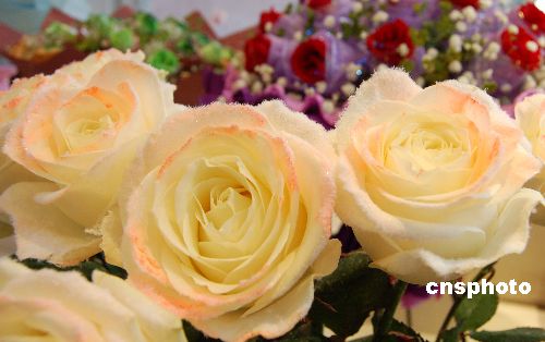 2月13日,安徽省肥西县某花店的店员在展示一款名为“白雪公主”玫瑰。据悉,该玫瑰每支价格近百元。“情人节”将至,各种玫瑰花热销,一些新颖别致、价格不菲的进口玫瑰深受年轻人的青睐。中新社发 徐勇 摄