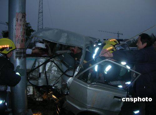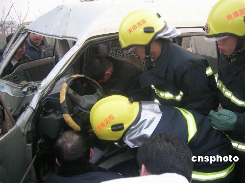 2月13日晨,消防官兵在救援被困车内人员。当天晨6时24分,江苏海门市王浩镇潘某与妻驾驶一辆面包车,满载一车活虾,赶往菜市场销售。车行驶海门常乐镇时,撞上路边电线杆,由于车速快,面包车头整个被撞凹进去,夫妻二人当场受伤被困车内。6时38分,消防队员赶到现场,潘某妻子头部受伤处于半昏迷状态,潘某满脸鲜血腿脚骨折,两人被卡车内。消防队员立即采取急救。7时许,在消防队员的努力下,潘妻与潘某先后被成功救出。中新社发 萧轩 摄