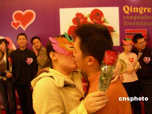 2月14日是西方情人节,古城西安举行了以“让爱升温”为主题的“激吻”大赛,吸引了众多情侣前来参赛。最终,90号情侣李欢、张浩和99号情侣李斌、鲁静以33分钟的成绩并列冠军。 中新社发 王振 摄
