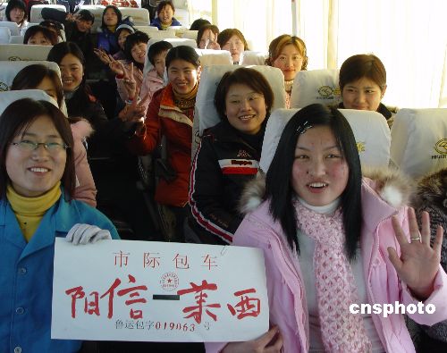 2月15日,300余名在青岛、淄博及天津等地打工的山东阳信籍打工妹,分别乘坐10台专车,回到家乡过春节。春节临近,阳信县妇联组织大型客车,将打工妹接回家过年。当日,妇联还在外出务工的打工妹中评选出10名“优秀打工妹”,对她们进行表彰。中新社发 李树坤 摄