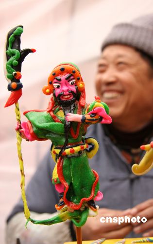 2月15日,农历春节将到,在安徽蒙城县历史文化广场,一位民间艺人用手捏制的、各种颜色的泥人,吸引了孩子们的眼球。中新社发 胡卫国 摄