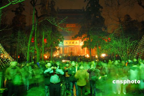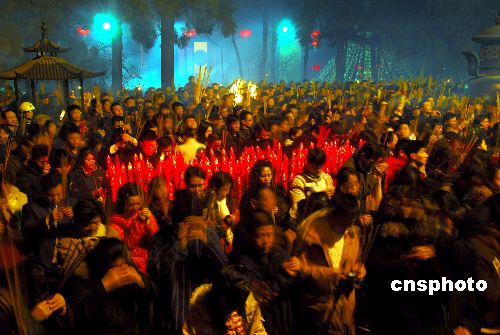 图为烧香的人群。每年除夕和大年初一,到杭州灵隐寺烧头香的人气颇旺,今年限量发售的5000张门票早已销售一空。2007年2月17日除夕夜8时许,购到门票的杭州市民和外地来杭的香客就开始陆续进入灵隐寺。零点钟声敲响前后及寺庙内的108响钟声响起期间,烧香进入高潮。大雄宝殿内外烟雾缭绕,香火弥漫,人山人海,但却秩序井然,忙而不乱。中新社发 郑从礼 摄