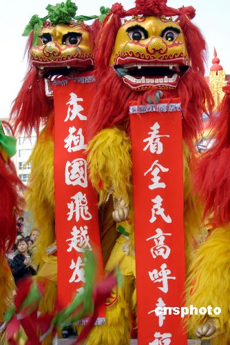图为表演进入高潮,金狮口吐对联表达祝福。2007年2月18日,新年初一,来自河北的舞狮队在北京厂甸庙会为游览者表演“ 三狮滚绣球”等杂技绝活,赢得阵阵掌声。中新社发 杨一飞 摄