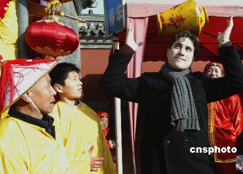 2月20日,北京历史最悠久之一的东岳庙庙会吸引假日游人,作为老北京历史悠久的庙会自恢复以来已举办8届,是次庙会的“幡鼓齐动十三档”是北京传统庙会的代表会档,花会进行盛装展演,载歌载舞,锣鼓喧天,为节日的京城增添浓厚的喜庆气氛。庙会上外国人即兴“顶花坛”。中新社发 钱兴强 摄
