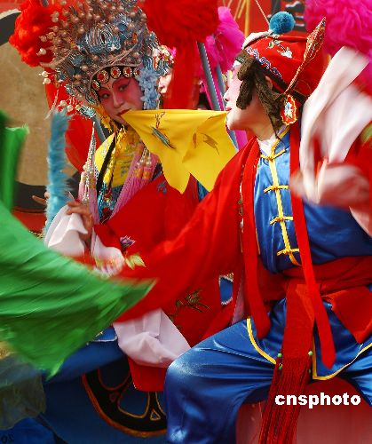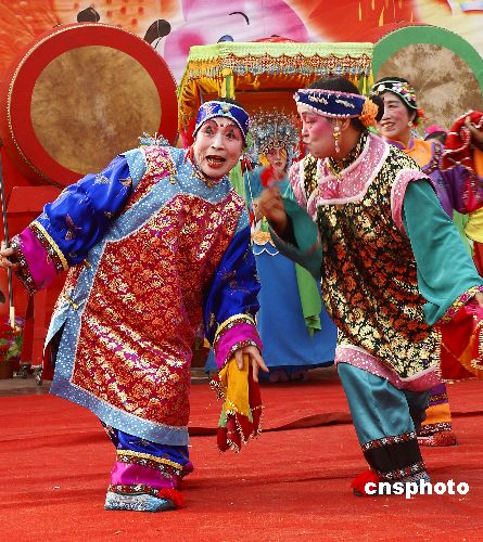 2月19日,北京莲花池公园庙会上的扭秧歌演出,让在游客们领略了这一传统民俗表演项目灰谐、幽默、泼辣、风趣和喜庆的特色。中新社发 于虤虤 摄