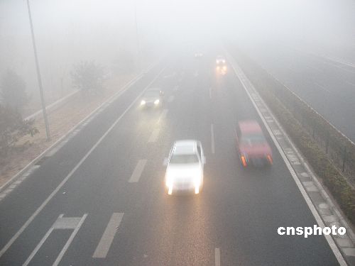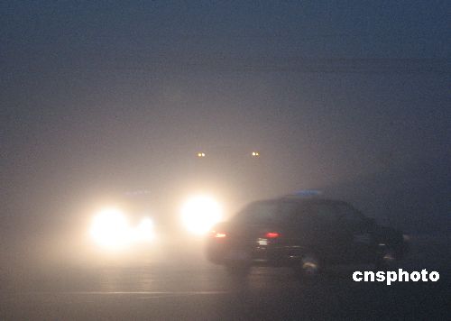 2月21日(农历正月初四)清晨,北京遭遇罕见大雾,至早七时能见度仅三十米左右,给交通和市民出行造成了很大影响。图为街道上的汽车均已打开雾灯。中新社发 魏明 摄
