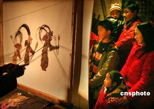 春节期间,山东枣庄民间艺人邢如雨精心编排了《西游记》、《八仙过海》等部分皮影剧目,巡回到附近乡村义演,为欢度春节的乡亲们送上了一份独特的精神食粮。中新社发 李宗宪 摄