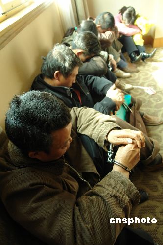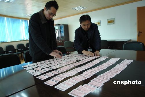 2月26日,广州铁路公安局衡阳铁路公安处“蓝盾二号行动”打炒小分队民警根据旅客提供的线索,在衡阳市珠晖区某饭店一举捣毁一个专门用旧火车票进行挖补,然后贩卖给旅客的黑窝点,当场抓获嫌疑人3名,收缴假火车票300多张,价值15139元。中新社发 郑亚军 摄