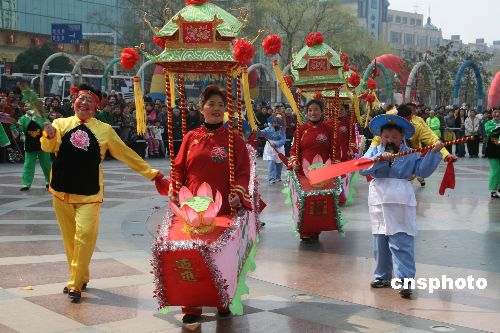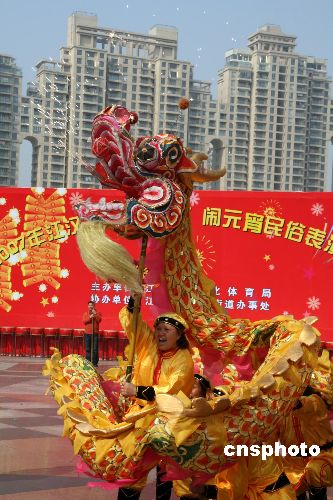 | 第六届全国城市运动会和第八届中国艺术节,2007年将在湖北省武汉市隆重举行。2月26日,为当好东道主热情迎嘉宾,江汉区为迎“两会节”在汉口西北湖广场举行了闹元宵民俗表演比赛活动,来自唐家墩等13条街道114个社区的居民群众业余文体爱好者参加了表演比赛,他们在现场为中外观众,奉献一道靓丽的闹元宵民俗大餐。中新社发 李长林 摄