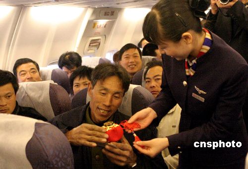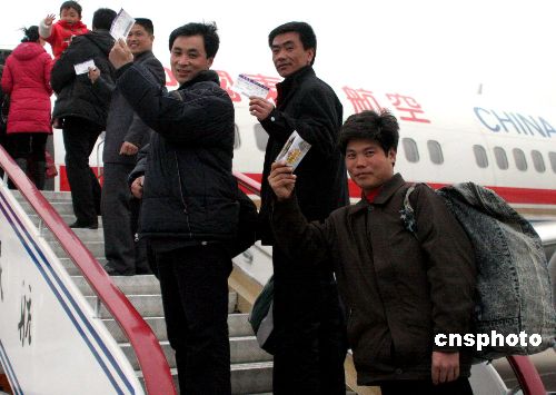 2月28日,在江苏连云港市白塔埠机场,首批乘坐包机的100多名农民工飞往上海。春节过后,为使外出务工的农民工快捷返城,民航连云港站,从中国东方航空公司调配客机,以包租机的方式将该市外出农民工,分批送往务工城市。 中新社发 王振 摄
