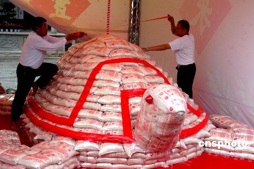 三月一日,在泉州天后宫广场内,两位来自台湾澎湖县的“米龟”制作师傅正在为“米龟”做最后的修缮工作。这只“米龟”共由一千两百袋、六千公斤平安米筑成,届时,澎湖“乞龟”祈福的民俗表演将首次在泉州展现。中新社发 傅丹丹 摄