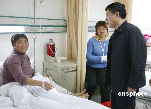 2007年3月1日下午5时许,在“2·28”新疆吐鲁番大风吹翻火车事故中受伤的旅客得到及时救助,乌鲁木齐铁路局领导到医院慰问伤者。中新社发 马蕙萍 摄