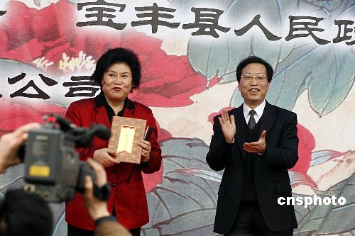 三月二日,中国曲协主席,著名评书表演艺术家刘兰芳从河南宝丰县县长王宏景手中接过荣誉证书,成为宝丰的“荣誉市民”。当日,一年一度闻的宝丰马街书会拉开帷幕,中国曲协主席刘兰芳、知名相声演员常贵田等曲艺表演艺术家到会助兴。中新社发 慎重 摄