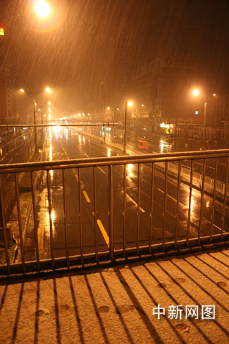 二月三日深夜,经历一天春雨之后的京城飘下大片雪花,这场“正月十五雪打灯”的瑞雪有望成为去年这个暖冬以来北京市区最大的一次降雪。尽管雪量较大,但由于初春地表温度较高,因此至四日凌晨仍未见市区路面出现积雪。 中新网 余瑞冬 摄