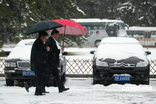 三月四日,经历一天春雨之后的京城降下入春以来最大的一场雪,全国政协十届五次会议委员驻地北京友谊宾馆内积雪覆盖了地面。中新社发 杜洋 摄