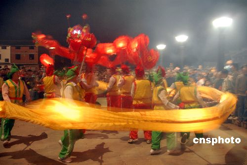 3月3日晚,浙江仙居县民间艺人在皤滩古街表演“卷地龙”节目。当晚,浙江仙居县在皤滩古街举行“舞龙闹元宵”活动,欢庆元宵佳节。中新社发 华文武 摄