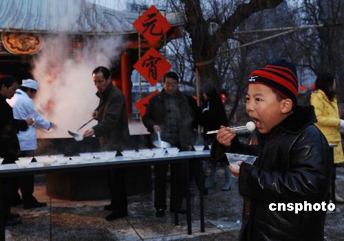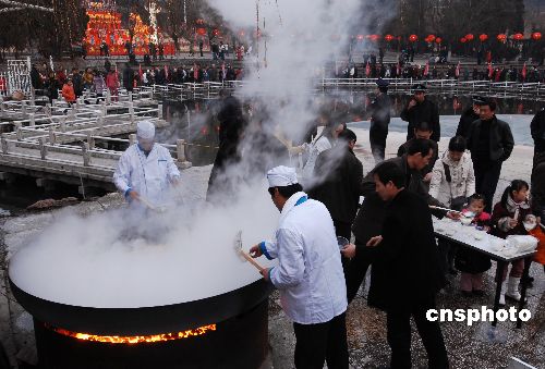 3月3日,500百名市民和游客在大连劳动公园荷花池品味元宵。为把元宵节闹得红火,大连市在劳动公园推出20余个系列元宵供游客免费品尝。煮元宵用的大铁锅为特制的,直径为2.5米,可供百人同时就餐。数百人列队品元宵又成了公园里的一道独特风景。中新社发 刘德斌 摄
