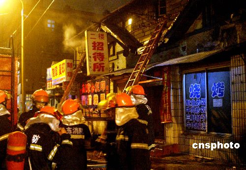 3月4日晚,丹东站前棚户区一小旅馆突发大火,造成两人死亡。起火当时,有三名青年从二楼窗口顺利逃生。接报的119特勤出动了10辆消防车对火灾进行扑救,30分钟后扑灭大火。据了解,死者都是春节后来丹的务工者。目前起火原因正在进一步调查中。据悉,春节前当地公安消防等部门刚对这片棚户区进行消防等方面的安全检查,但由于棚户建筑年久失修,存在着火灾隐患。中新社发 陈浩浩 摄
