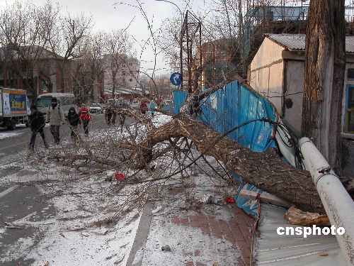 3月5日,大连市一街道旁的大树被昨日的大风刮倒,影响了市民的正常出行。3月4日,突如其来的狂风、暴雨、降雪给大连市市民的生活带来了不少麻烦,市区内的许多地区被迫停水停电。中新社发 董永源 摄