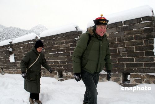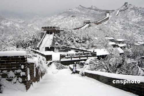 中国民谚云:“正月十五雪打灯,八月十五云遮月,风调雨顺好年景”。二00七年三月四日,农历正月十五,一场大雪飘飞北京长城。如此大的春雪,在八达岭长城春雪史上还是第一次。中新社发 张民 摄