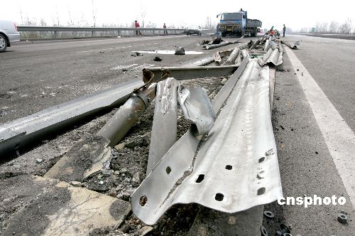 3月8日,在大运高速侯运段发生一起运煤车与客车相撞惨祸,2人当场死亡,4人在送往医院途中死亡,另有59人正在医院接受治疗。当日凌晨3时20分左右,一辆运煤车从侯马向运城方向行驶,至大运高速侯运段54公里附近时,车辆失控撞倒100多米高速隔离护栏,后穿越中线,侧翻在逆向车道上。载有60名乘客由西安发往原平的大巴躲避不及,随即和货车相撞。据交警告知,客车上四川民工占了相当比例。运煤车很可能超载,事故原因有待进一步调查。中新社发 陈卫 摄