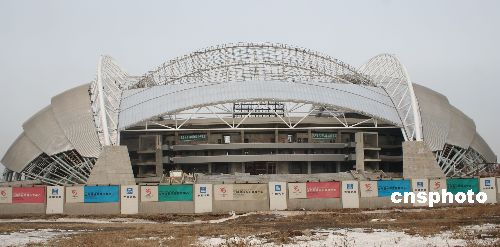 3月13日,沈阳奥体中心工人们顶着寒风安装玻璃屋面。据悉,沈阳奥体中心外观呈花瓣形的屋面位于体育场的东西两侧,屋顶全部采用阳光板、玻璃等透光材料,这使奥体中心内的草坪充分享受阳光照射,延长草坪的养护周期。中新社发 刘宝成 摄