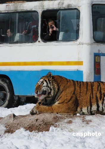 3月14日,大雪过后的黑龙江牡丹江横道河子猫科动物繁育中心东北虎林园,老虎在雪地上撒欢嬉戏。据工作人员介绍,最近几天,来虎园的游客不断增加;往年这个时节是淡季,但2007年淡季不淡。中新社发 张克非 摄