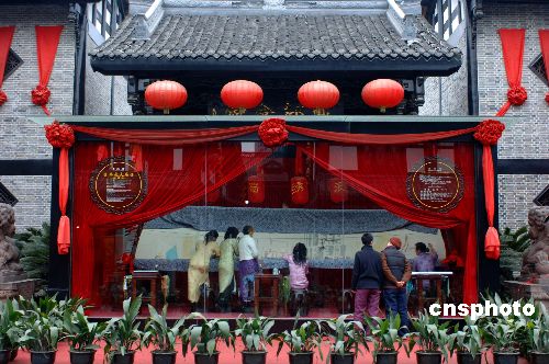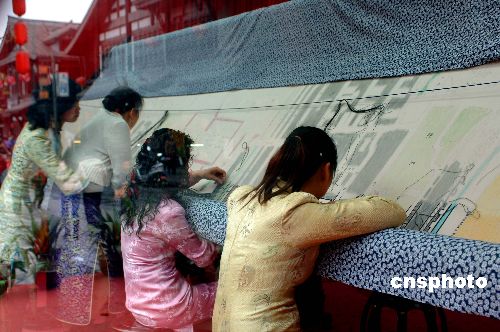 2007年春,成都新建的古文化街文殊坊里,身着旗袍的蜀绣女工正在制作世界最大的蜀绣。蜀绣与苏绣、湘绣、粤绣一起并称为中国的四大名绣。中新社发 廖攀 摄
