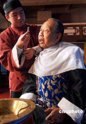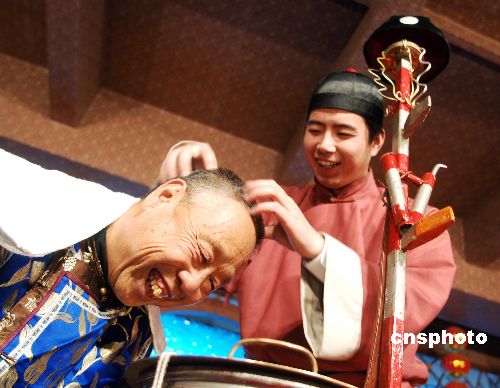 三月二十日为农历二月初二,民间称“龙抬头”,象征着春回大地、万物复苏,民间一直有“理发去旧”的风俗。十九日,京城叫卖艺人张振元带着剃头挑子,在北京老舍茶馆表演原汁原味的老北京二月初二剃头民俗。中新社发 廖攀 摄