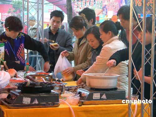 第三届中国(重庆)火锅美食文化节于3月20日-3月22日在重庆江北区北滨路金源时代购物广场隆重举行。火锅节重头戏之一的“中华名特小吃”展销提前开展。中新社发 金城 摄