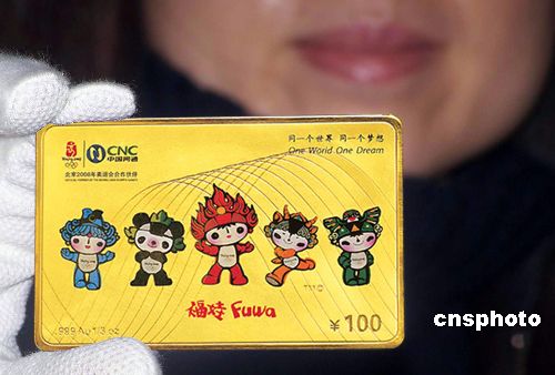 | 3月20日,经北京奥组委批准,中国网通为二00八北京奥运会特别发行的《北京2008年奥运会贵金属纪念电话卡(第1组)》在北京面市。这套“奥运金卡”全套共7枚,包括1金5银1铜,创意来源于奥运会的金、银、铜牌。首次结合了“奥运、黄金、电话卡”三大领域的投资热点,将时下最热门的奥运会徽、吉祥物等元素以纯金纯银材质得以呈现,加之卡本身“带有面值”,是奥运收藏史上的一次伟大创新,填补了国际邮币卡高端投资收藏领域一项空白。中新社发 潘旭临 摄