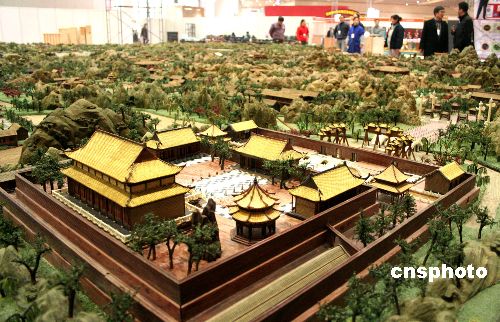 3月21日,大型皇家宫苑“圆明园”全景式巨型仿真立体雕塑(150:1)在大连亮相,以参加将于22日开幕的大连艺术博览会。这是上海某公司经十年时间制作完成的特大型皇家园林立体雕塑。据悉,这座长18米,宽14米,占地面积200余平方米的皇家宫苑雕塑,是目前国内最大的雕塑艺术品,前来参加大连艺博会展出是其制成后的首次亮相。中新社发 徐德武 摄