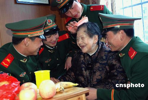 3月22日,武警战士在无锡金星街道荣颐休养院与老人谈心。当日,武警无锡市支队二中队刚下连的新战士到荣颐休养院,举行“爱心一帮一”认亲仪式,继续弘扬连队传统与老人们结对“认亲”。新战士们用津贴买来水果和营养品送给老人,帮助他们料理个人事务,与老人们拉家常。日后,他们将定期来休养院进行“一帮一”助民活动。中新社发 唐占军 摄