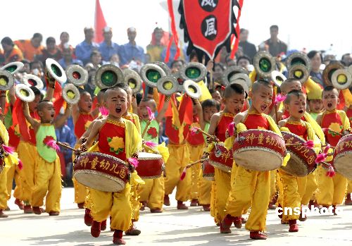 3月22日,山西省临汾市神童幼儿园的孩子们正在加紧排练威风锣鼓。 神童幼儿园少儿锣鼓队是由150名儿童组成,他们多次参加省市国家级的比赛和演出,并多次获奖。3月28日,他们将参加在北京世纪坛举行的由中华鼓乐大会组委会主办的“北京奥运开幕倒记时500天鼓乐庆典晚会”。 中新社发 张旦 摄
