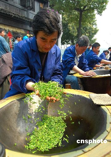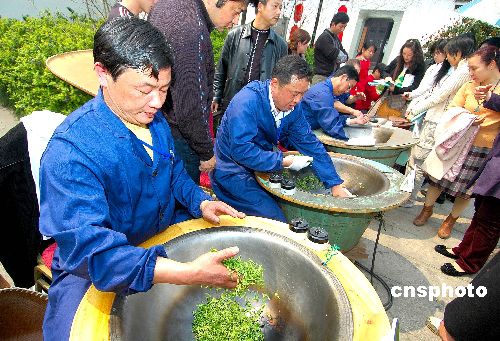 3月22日,2007年西湖龙井炒茶技艺大赛在杭州下茅家埠“西湖·百茶汇”举行。20名经层层选拔脱颖而出的炒茶能手在大赛现场一决“雌雄”。最终炒茶王的100克茶叶被拍出11万天价。图为炒茶技艺大赛现场。中新社发 引炜 摄