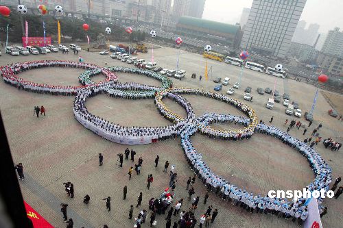 2007年3月23日上午9时,辽宁沈阳“为祖国争光、为奥运添彩”的“志愿沈阳、人文奥运”奥运志愿者招募活动启动。由2008名大学生组成的五环标志成为开幕式的亮点。活动期间将开展2007年奥足赛沈阳赛区测试赛、2008年奥足赛沈阳赛区志愿者招募工作。中新社发 赵敬东 摄