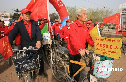 3月27日,离北京奥运会正式举办还有500天,济南市五十多位老人在年过七旬的郭玉伦老人的组织下,骑车环绕城市。他们一路向市民宣传奥运精神,呼吁大家创建文明城市,以良好的城市和人文环境迎接奥运会,向外国朋友展示良好的济南形象。中新社发 周青先 摄