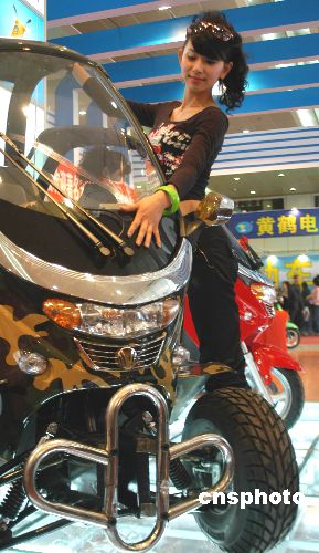 4月2日,在武汉开幕的湖北首届电动自行车展览会上,车模成为展会亮点。中新社发 楚天行 摄