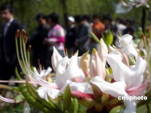 4月4日,游人在欣赏盛开的“桂花杜鹃”。近日,一种十分珍稀的“桂花杜鹃”亮相苏州拙政园,这种近年从荷兰引种的杜鹃,花瓣形状奇特,艳丽的花朵让中外游人一饱眼福。中新社发 王建康 摄