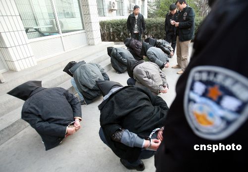 8 人结伙,银行内踩点,银行外尾随,偏僻处强抢取款人。北京海淀警方驱车千里北上内蒙,在当地警方的配合下, 8 名团伙成员相继落网。 4月4日18时20分 ,随着海淀刑警将犯罪嫌疑人押解回京,发生在本市的 10 余起尾随取款人抢劫系列案件告破。中新社发 胡蓉 摄