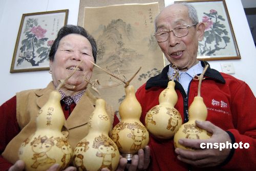 为迎接奥运会,北京市民王大爷亲手创作烙绘“葫芦福娃”,希望以独特的方式表达全家喜悦期盼奥运的心情。中新社发 徐曦弋 摄