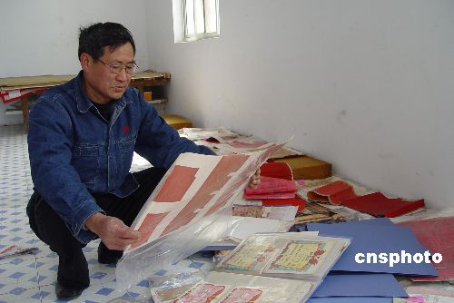 四月六日,河南开封退休工人张洪军正在整理他收藏的中国古代婚书。张洪军十八年收藏了三百多封婚书,其反映的婚俗历史从清代道光年间始,历经太平天国,清光绪、宣统,民国以及新中国成立后不同的历史时期,允婚书、卖身契、童养媳帖等各种形式的婚书带有婚姻制度沿革的深刻烙印。中新社发 朱晓娟 摄