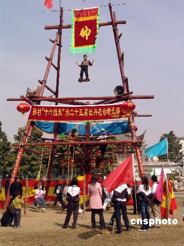 “十六挂转秋”是起源于明朝万历年间一项民间游戏项目,距今已有400多年历史。它分上中下三层,场面颇为壮观:顶端,迎风飘扬的帅字旗下,是一名高空蹬秋表演者;中层,由4名壮汉在两个转轮中间手推脚蹬;下层,在一根冲天柱的两个转轮上,分内外两层16个秋千,分别各自按顺时针、逆时针方向转动。随着号子声,整个秋转荡起来,浑然一体,悠然自得。