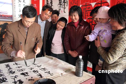 四月十一日,梁前进一边唱歌一边用左右手表演书法。河南省沁阳市西王曲村的一位叫梁前进的农民,多年来练就了右手写唐诗、左手写宋词,右手写行草、左手写反书,双手同时写出头对头、尾对尾书法,边唱歌,边双手写字的“绝活”,在当地被称为书法“怪才”。中新社发 张宁宁 摄