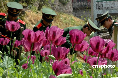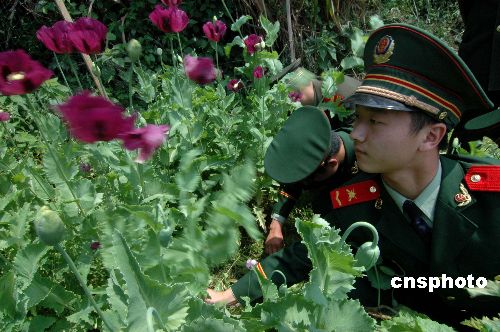 4月13日,浙江台州大陈边防派出所民警在大陈岛查获两起非法种植罂粟的案件,当场铲除罂粟500余株。据介绍,罂粟已开花,即将成熟,因铲除及时尚未造成危害。中新社发 朱孝钦 摄