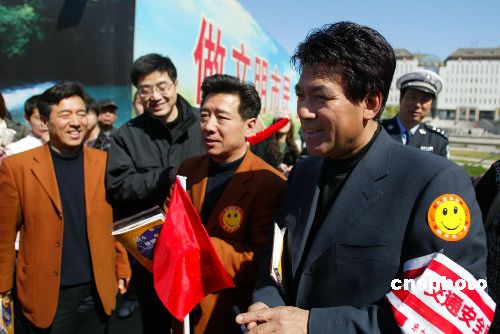 四月十四日,北京开展以“共创交通文明,共享安全和谐”为主题的交通安全宣传日活动,全市各主要大街、繁华路口、飞机场、火车站、长途客运站、公园、社区、超市商场、集贸市场共设立了四百多个宣传站点。图为演员朱时茂在北京西单文化广场当起了交通安全宣传员。中新社发 杜洋 摄